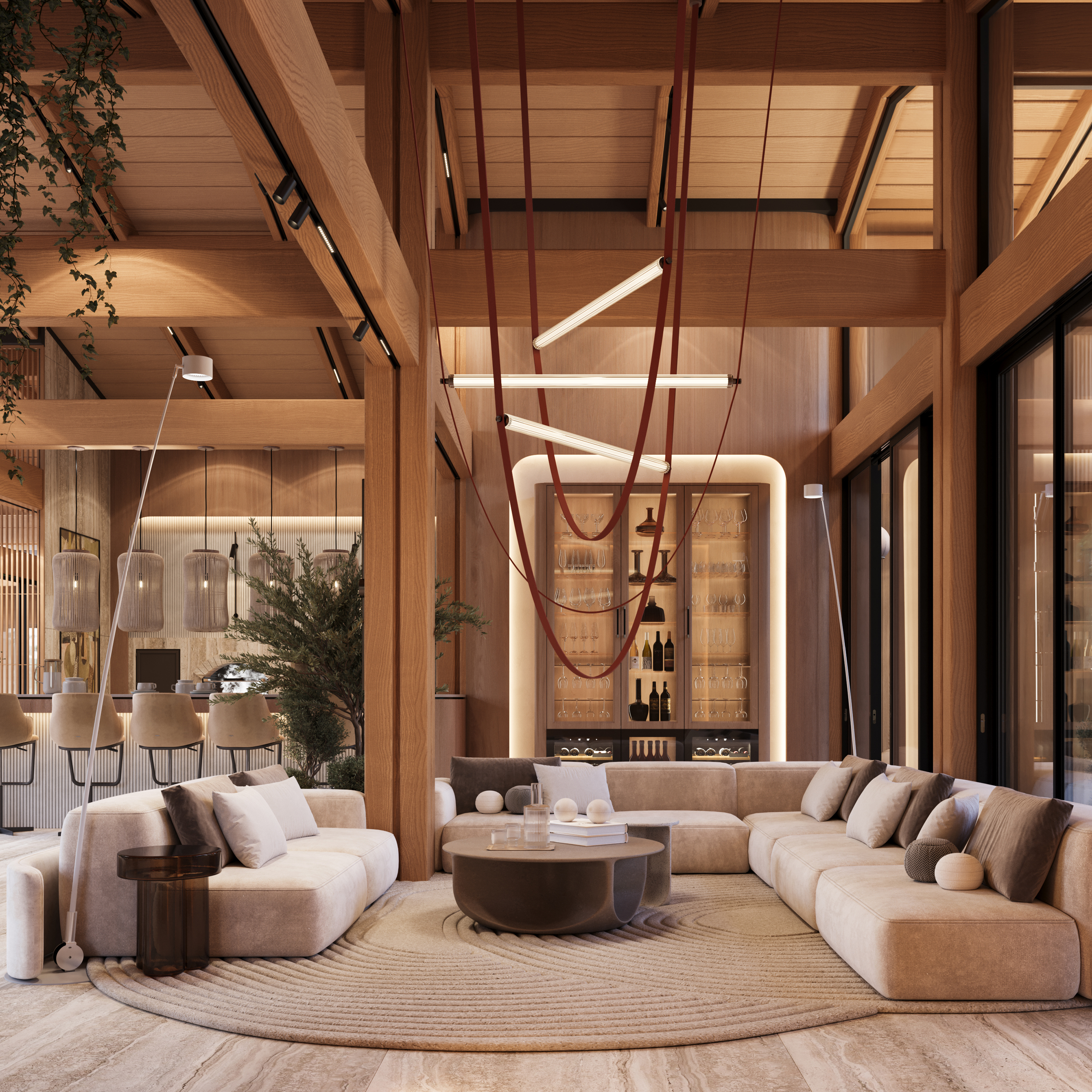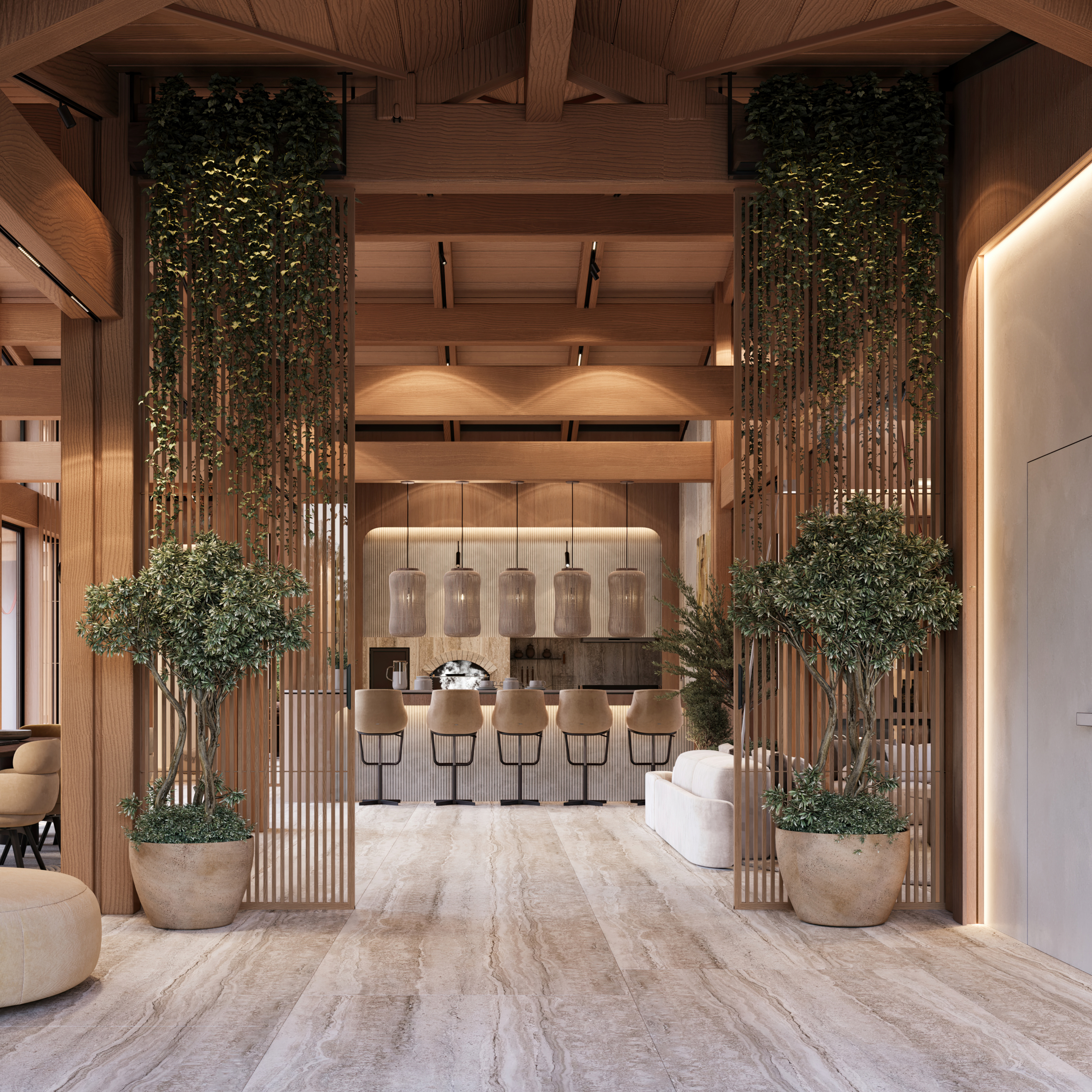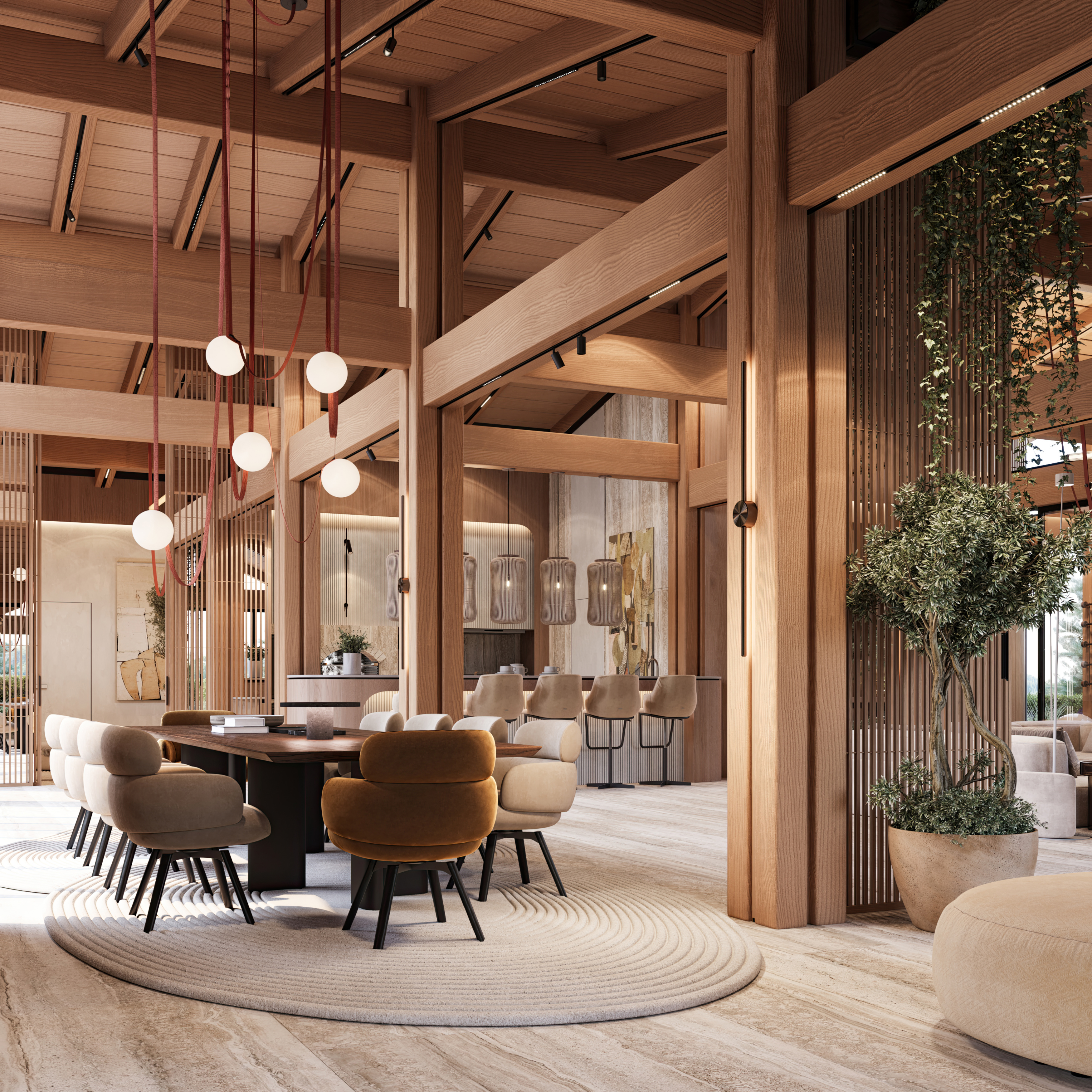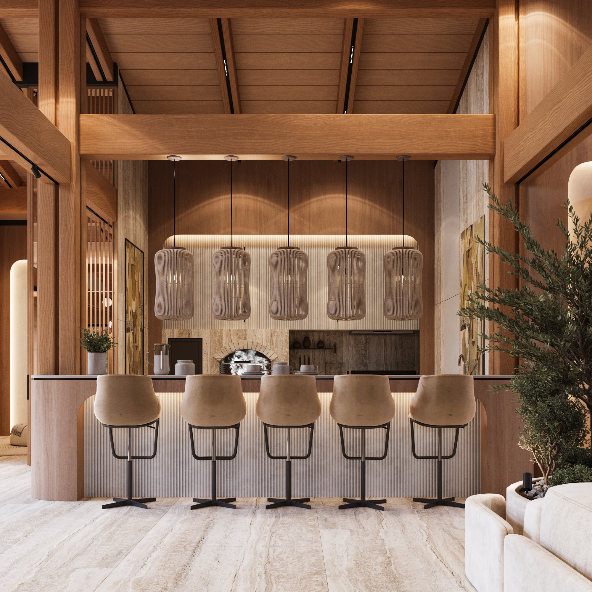 Svi ostali elementi oblikovani su s namerom da ostanu u njenoj senci, diskretno podržavajući prirodnu lepotu drveta i ističući njegovu toplinu i autentičnost. Obloge od kamena i drveta pažljivo su postavljene u zonama koje imaju posebnu funkciju, kako bi se suptilno naglasile različite ambijentalne celine i prostoru dodala nova slojevitost i osećaj topline.
