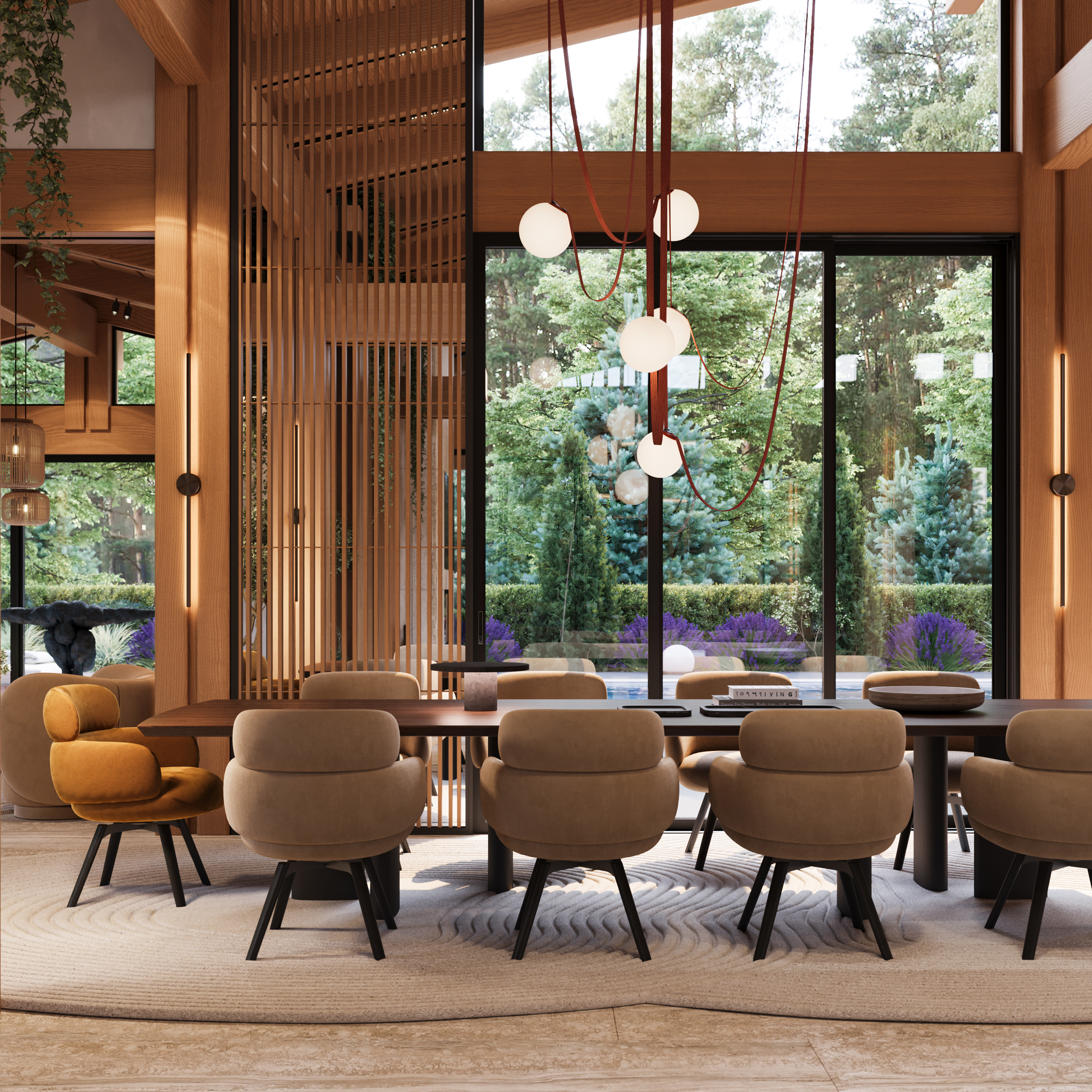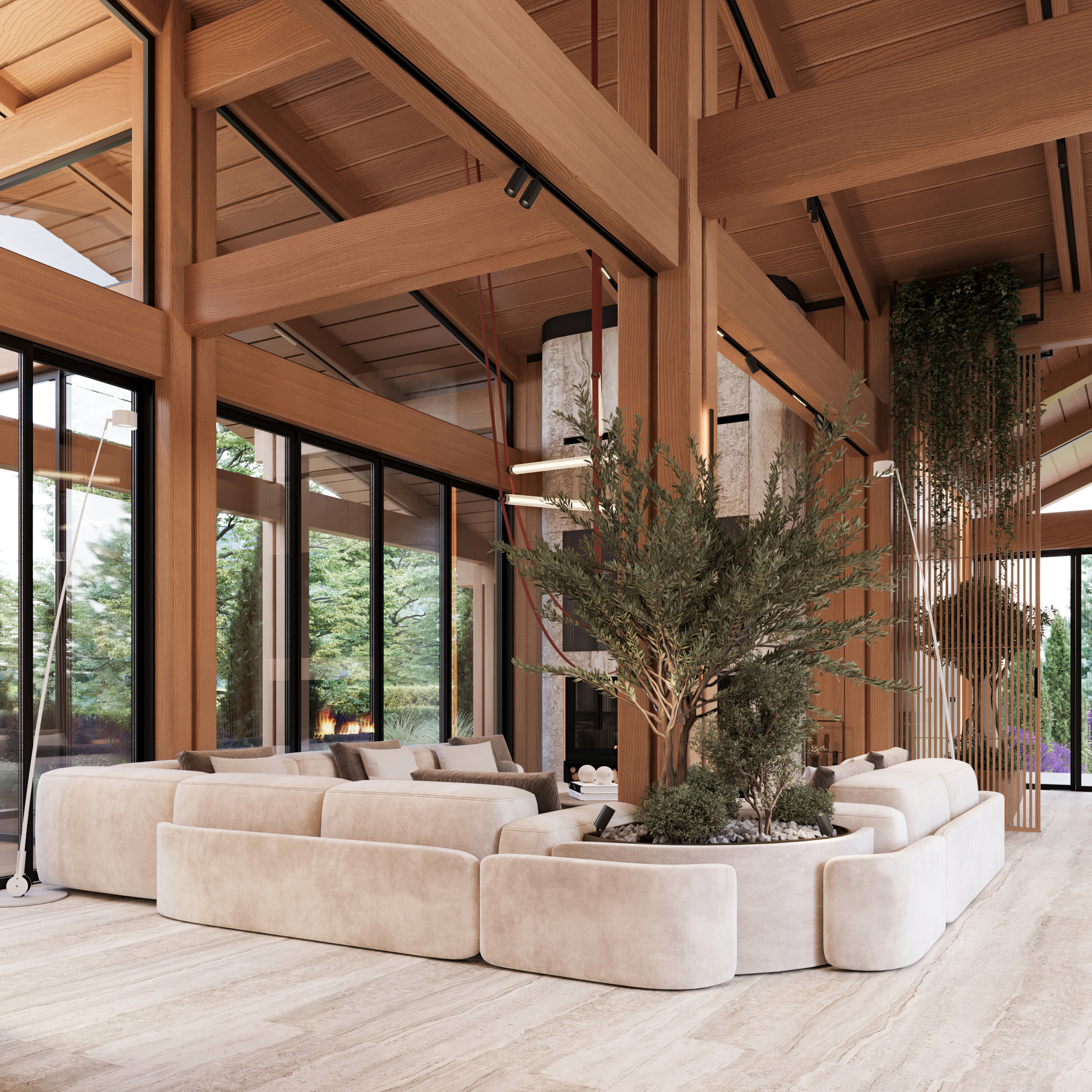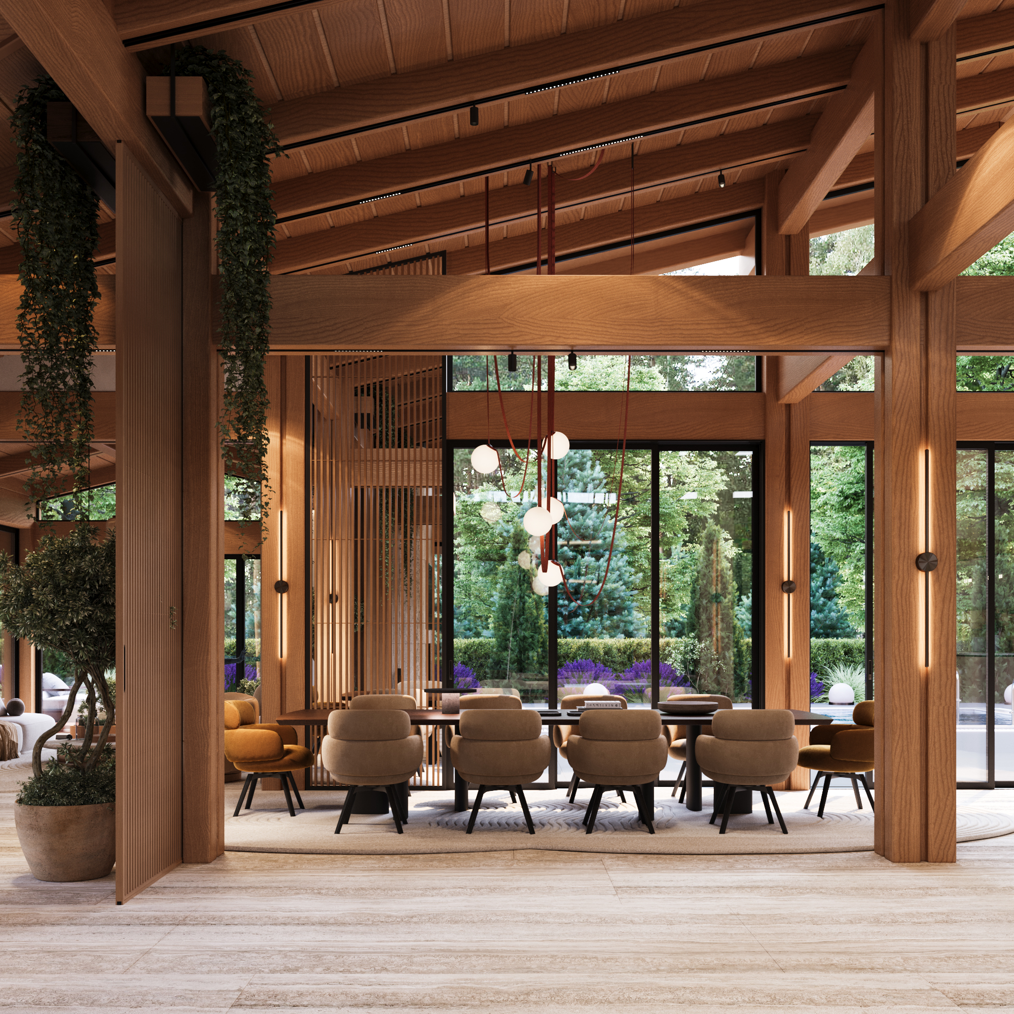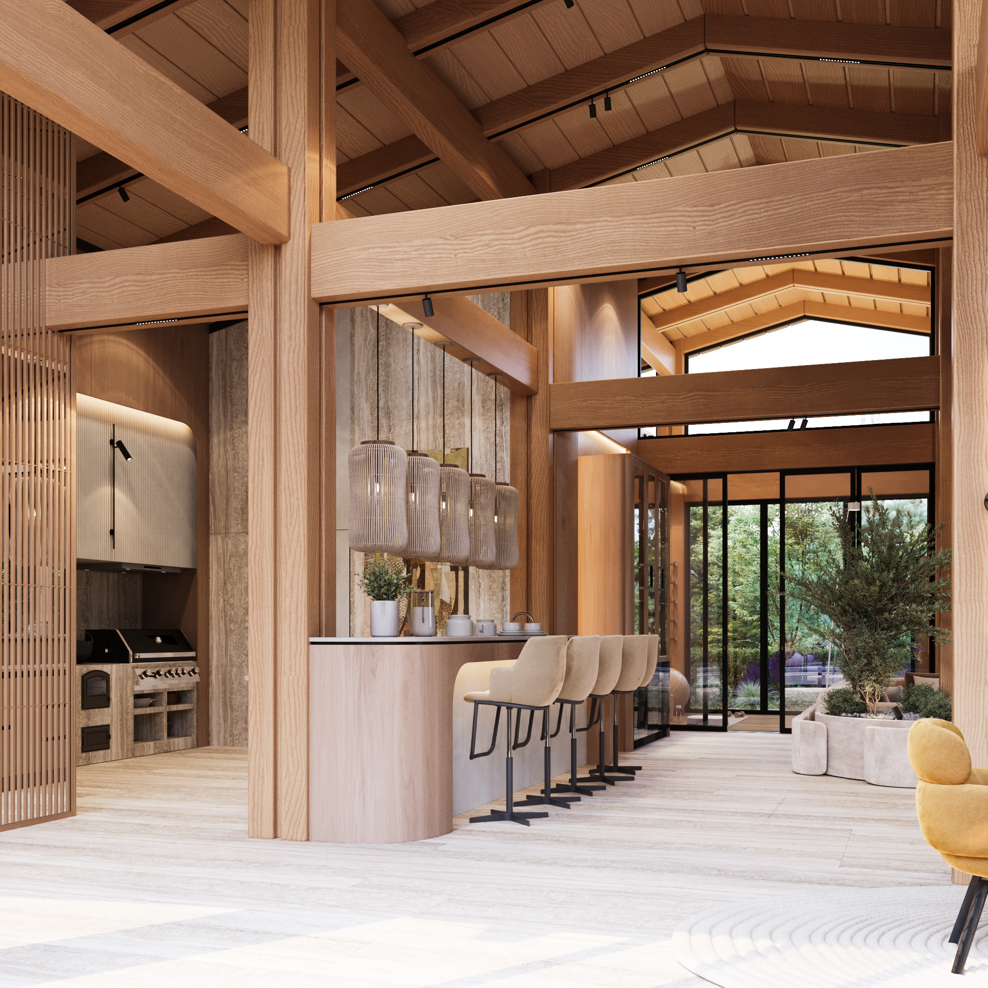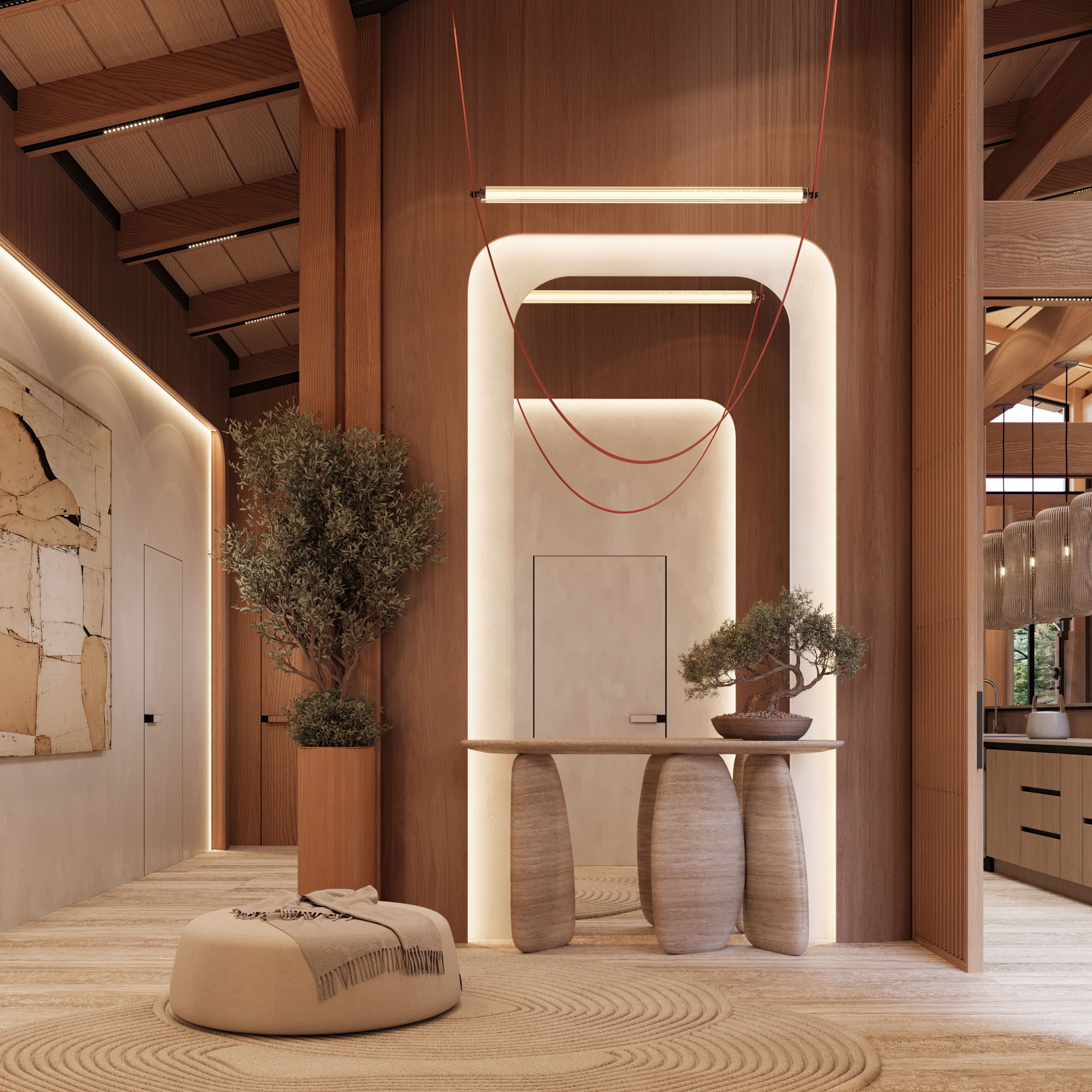 Svi ostali elementi oblikovani su s namerom da ostanu u njenoj senci, diskretno podržavajući prirodnu lepotu drveta i ističući njegovu toplinu i autentičnost. Obloge od kamena i drveta pažljivo su postavljene u zonama koje imaju posebnu funkciju, kako bi se suptilno naglasile različite ambijentalne celine i prostoru dodala nova slojevitost i osećaj topline.