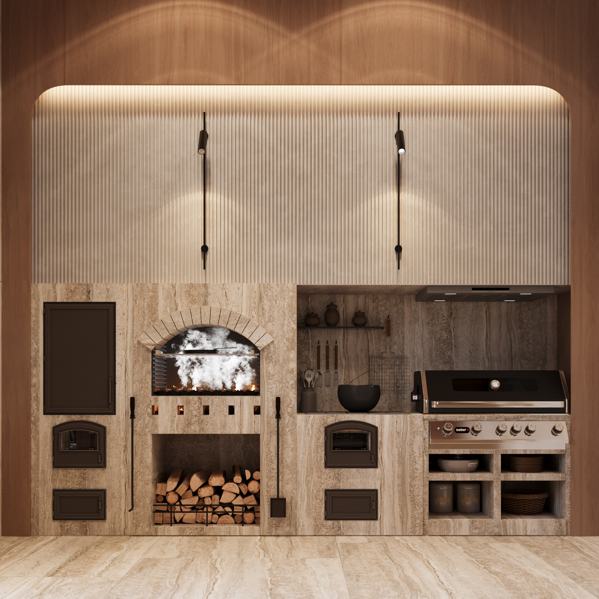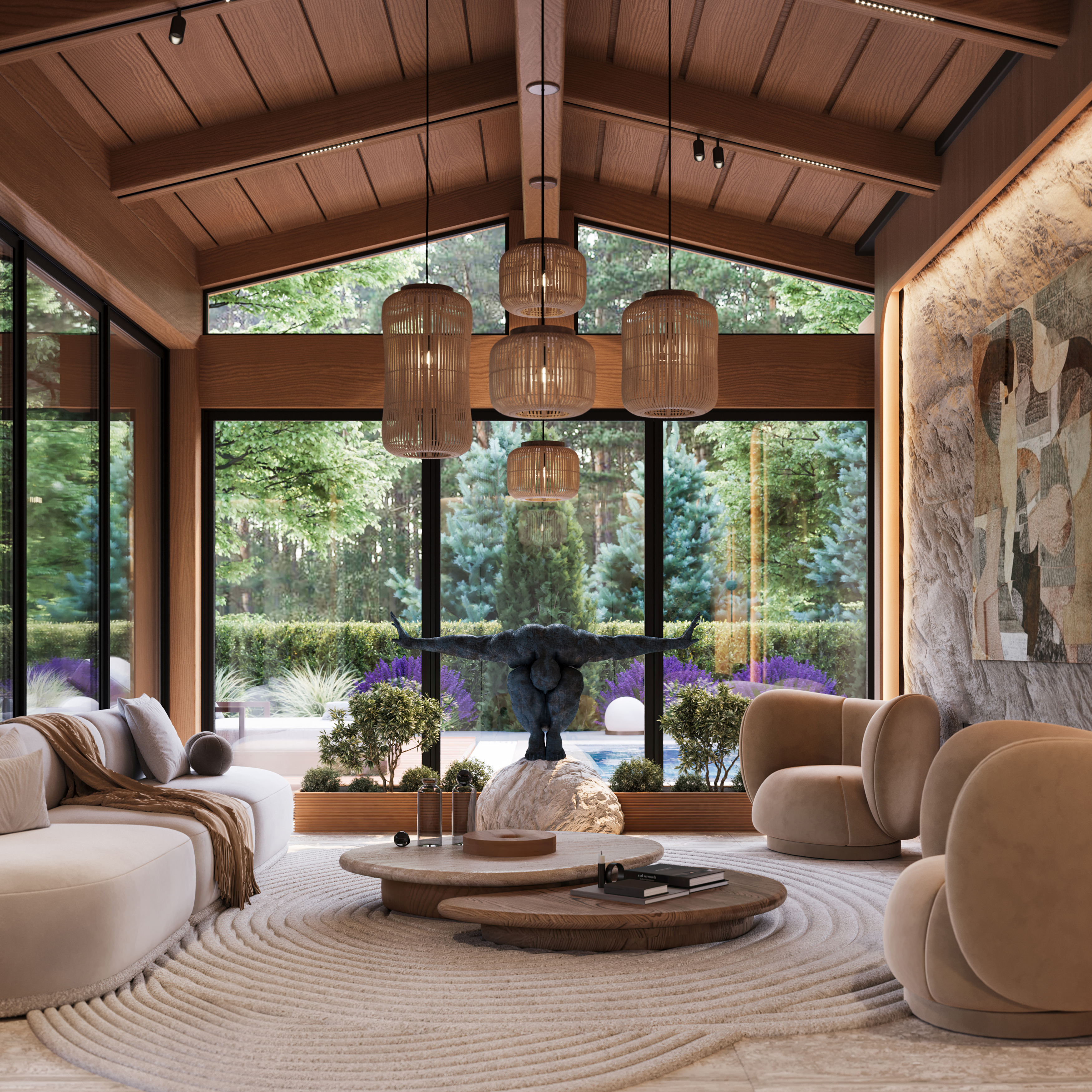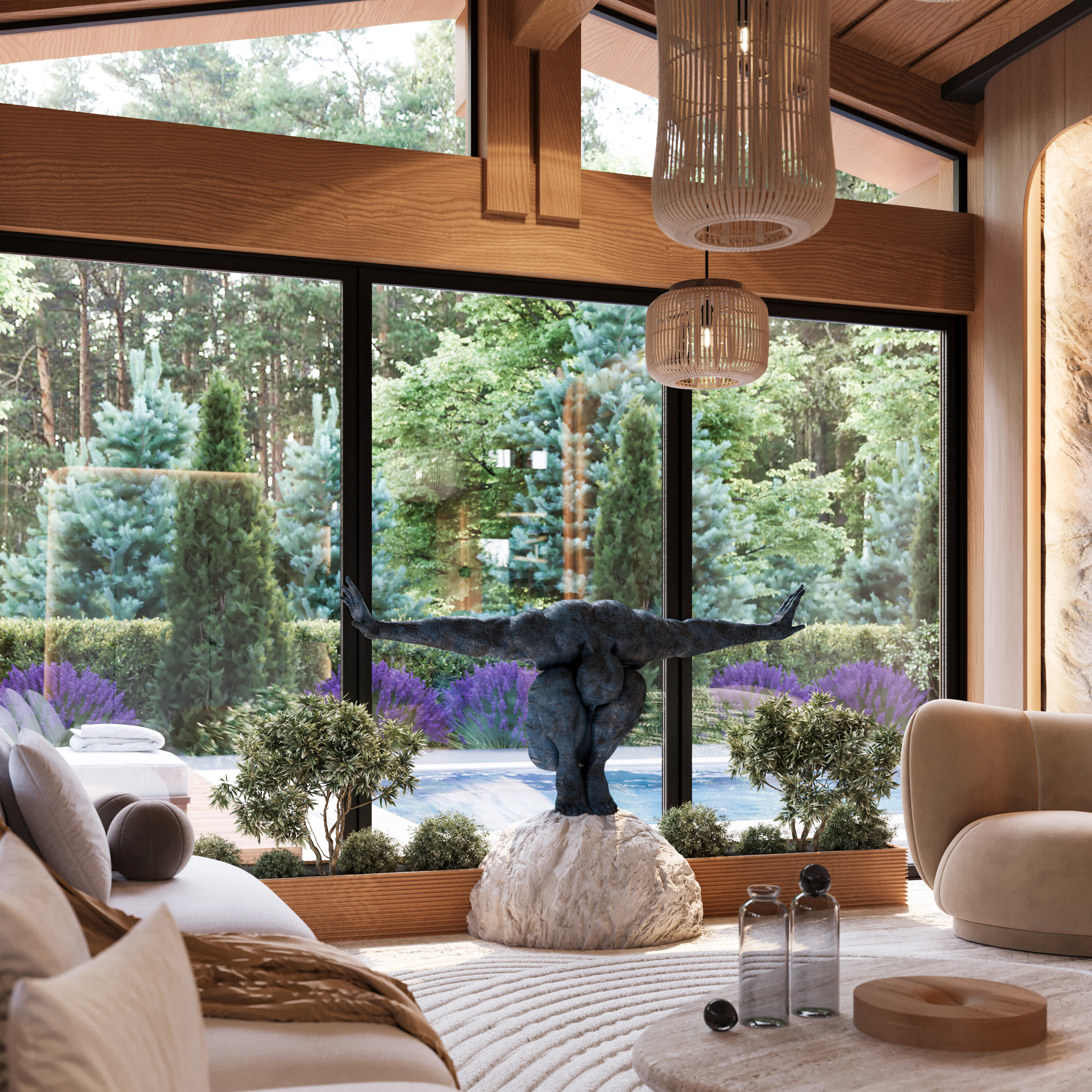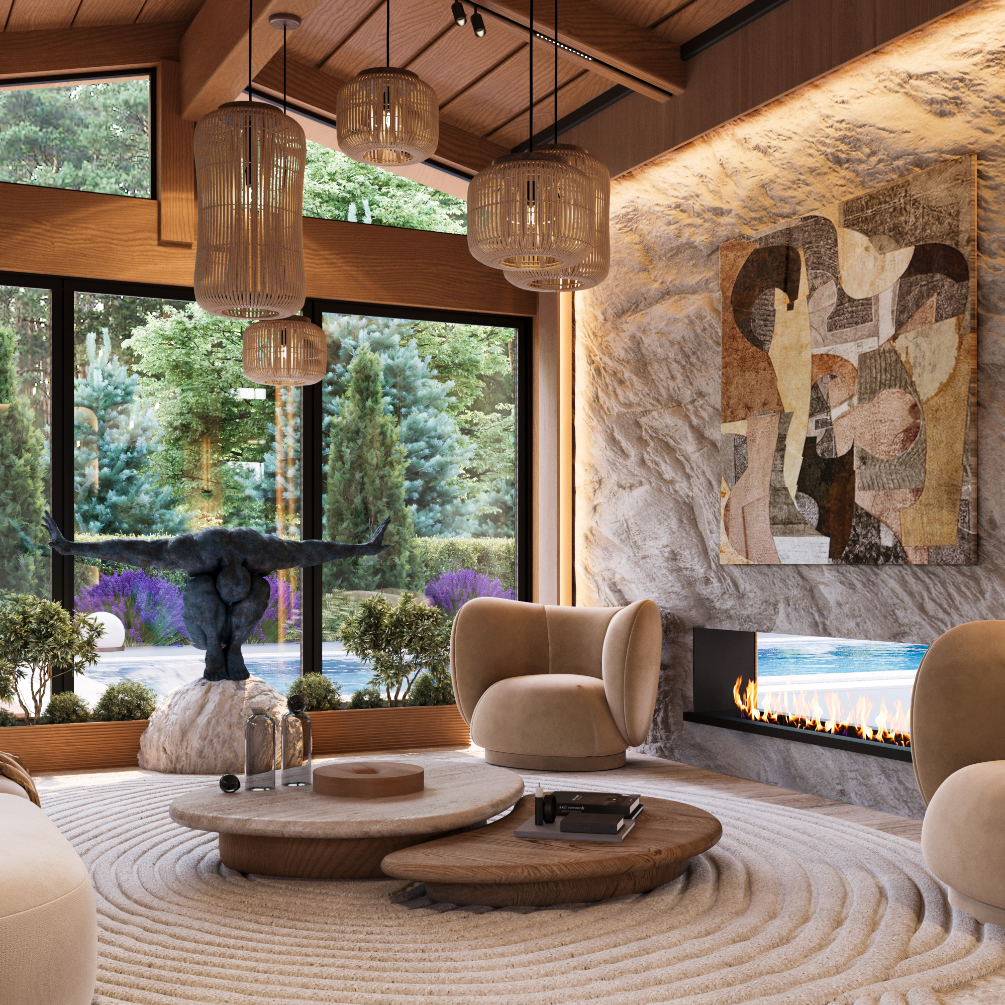 Svi ostali elementi oblikovani su s namerom da ostanu u njenoj senci, diskretno podržavajući prirodnu lepotu drveta i ističući njegovu toplinu i autentičnost. Obloge od kamena i drveta pažljivo su postavljene u zonama koje imaju posebnu funkciju, kako bi se suptilno naglasile različite ambijentalne celine i prostoru dodala nova slojevitost i osećaj topline.
