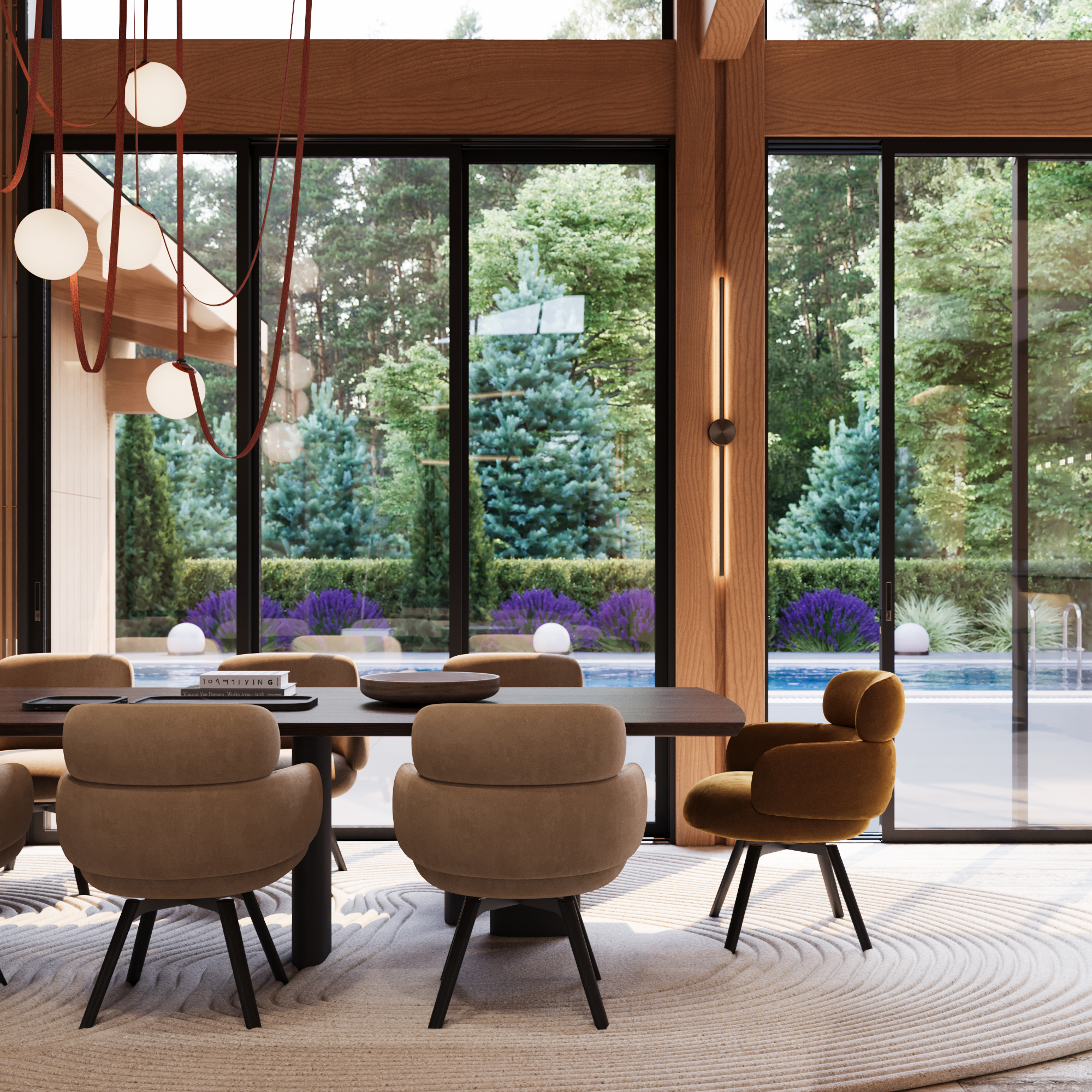 Rasveta je projektovana tako da se neutralno i nenametljivo integriše u drvenu konstrukciju krova, kroz šinsku rasvetu koja prati arhitekturu prostora. Na ključnim mestima, poput trpezarije i dnevne zone, postavljeni su lusteri sa izraženim skulpturalnim karakterom, koji dodatno definišu i vizuelno naglašavaju ove centralne prostore vile.
